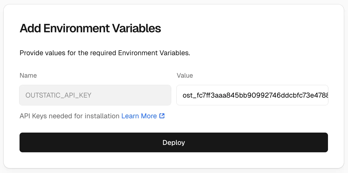 https://localhost:3000/outstatic - Generate an API Key. In Vercel, go to Add Environment Variables and paste the